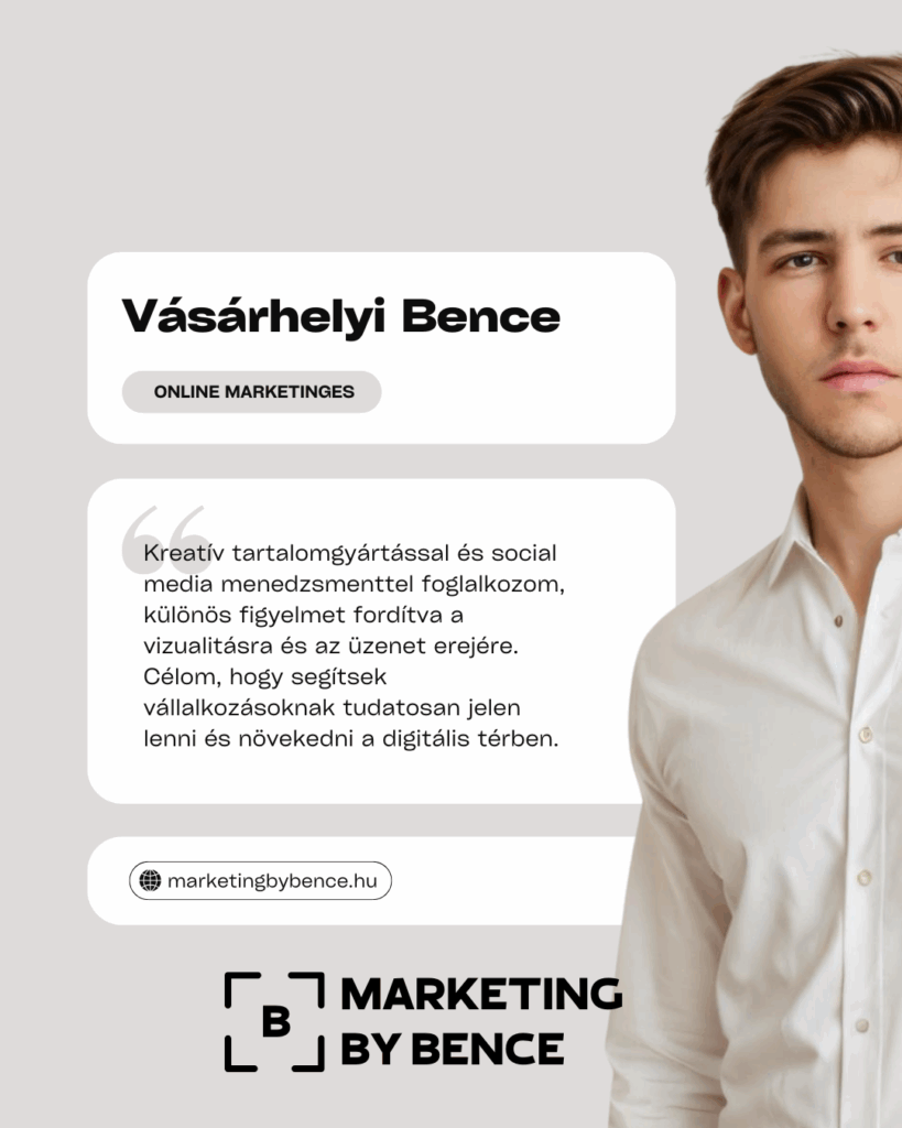 A Marketing by Bence-t azért hoztam létre, hogy segítsek a kis- és középvállalkozóknak láthatóvá válni – és nem csak a neten, hanem az ügyfeleik fejében is.